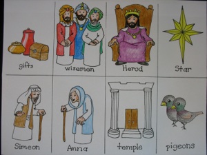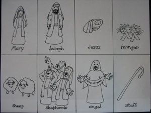 2、フィギュアのシートをプリントアウトします。ここではマリア、ヨセフ、赤ちゃんのイエス様を切り離します。フィギュアをしっかりさせるために、厚めの紙にプリントするか、シリアルの箱のような厚さの紙に糊付けします。