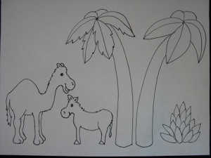 背景の飾りのオプション:椰子の木、らくだ、ロバ、植物をプリントアウトします。それらを切り取り、背景に貼ります。あるいは立たせます。フィギュアを支える台紙の作り方は下の写真を参照してください。木は背景に貼るか、ペーパータオルの芯に貼ります。より手の込んだ作品にするためには背景のフィギュアを多く作ります。
