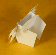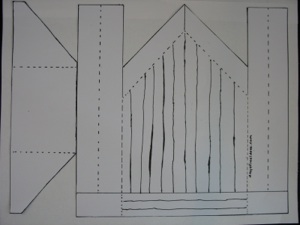 1、プリントアウトした馬小屋をカットして図に従って折ります。(詳細は、⑶馬小屋の作り方にあります)