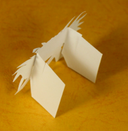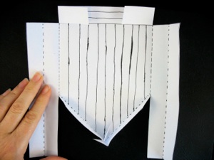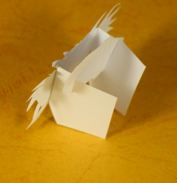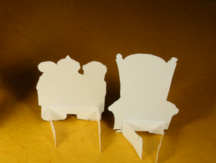 真ん中のところに糊をつけ、フィギュアの後ろに貼り付け、折った部分をひろげます。もしフィギュアを少し傾けたければ、左右の支えの下の隅を小さく三角に切り取ります。(写真参照)