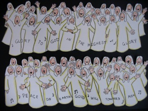天使のオプション:天使をプリントアウトします。それを二つのグループに分けて切り取り、背景の空に貼ります。そのとき、上の列を場面の左に、下の列を場面の右にします。もし多くの天使が現れる場面を演出したければ、ひとつの天使の列を背景の上の部分に貼ります。それを覆う背景と同色のフラップを天使が隠れるように背景上部にとめます。そのフラップの裏にもう一列の天使を上下を間違えないよう貼り付けます。そのフラップをめくると二列の天使が現れる仕組みです。(クリスマスの場面では天使は一人だけ登場することが多いのですが、それはクリスマスのお話の一部です。クリスマスのお話全てを語ることができるよう、私は時間をかけて沢山の天使を書きました。12のアイデアにこの沢山の天使を使った背景が出ています。)