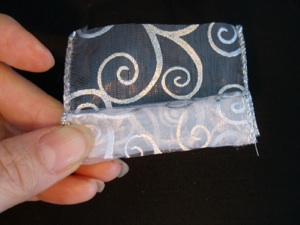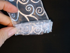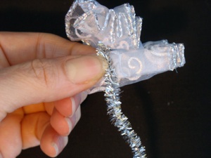 2、折ったリボンの一方の端から2センチのところでモールを2~3回ねじってしっかり留めます。これがベルトになります。