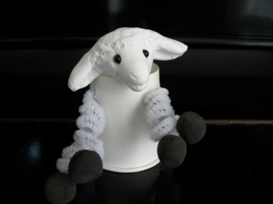 4、ペンチを使ってカップの中のモールをねじり、羊の足がとれないようにします。(この作業は先生がしてください)