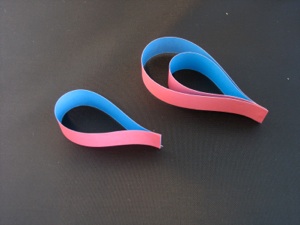 注:もし両面が異なる色の紙がなければ、二枚の色の違う紙を使っても同じように出来ます。ただし、糊付けには注意がいります。ねじれたりしないためには、まず一枚に糊をつけ、輪を作ってその上にもう一枚輪を貼り合わせます。