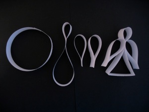2センチ幅の紙を21センチの長さにカットします。4枚用意します。二枚を重ねて涙型を作ります。内側の紙を下から引っ張って二重の涙型にして止めます。もうひとつ同じものをつくり、二つの涙型を糊かホチキス