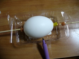 色を塗るーこのページの卵は全部アクリル絵の具で塗った土台になっています。(マーカーで装飾する以外)色を塗っている間あるいは乾かしている間卵にシミをたらさないようにするベストな方法として左の写真のように竹串に輪ゴムを付け卵をさしまた卵の上に輪ゴムを付けしっかり支えておきます。卵