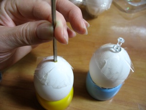 2. ハンマーを使い押しピンで卵の上と底に小さな穴をあける。大丈夫、まだ流れでません。