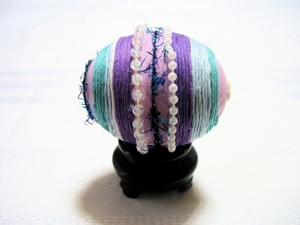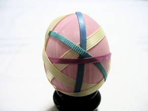 デザインはシンプルなので作るのは簡単に見えますが、そうではありません。ラインがまっすぐでなければ奇麗に見えません。私は幅広く細長くのり付けし、卵の周りに刺繍糸を巻き付けようとしました。しかし卵の周りに巻き付ける前にのりが乾いてしまいました。それで結局竹串で1〜2センチ糸の幅だけ卵にのり付けをする事にしました。そして順々に糸の幅だけ卵にのり付けしました。のり付けしたばかりの糸の幅のゆがみをまっすぐにするのに定規やまっすぐな縁を使うと便利です。確かにもっと手っ取り早い方法があるでしょうが、私はまだ発見していません。
