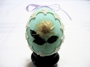 いったん花や葉っぱを張りたい所にのり付けしたら花を保護するためにラッカーやニスを塗ります。手工芸品店には押し花を売ってる場所もあります。もし自分で押し花を作るなら難しくはありません。花を摘んで本の下に置くか電話帳のページの間に挟みます。前もって卵の装飾に間に合うように押し花をしなければなりません。レースやリボンもまた花と良く合います。この花は百円ショップの押し花のシールです。
