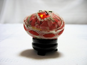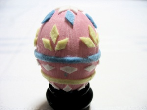 丸い形に切り抜くと時間がかかりますがこの卵はダイヤの形を使ってデザインしており切るのは楽です。ただ細長く切った布を斜めにチョキチョキ切るとダイヤの形が作れます。難しいのは小さいかけらをもち、片面にのり付けし張りたい所にそのかけらを張る事です。ピンセットだと仕事がやりやすくなります。もしダイヤが緑なら葉っぱのように見えるし、ピンクや黄色なら点をのり付けするとお花に見えます。