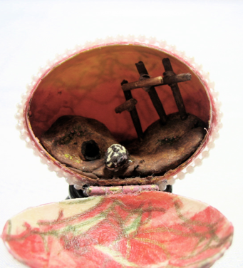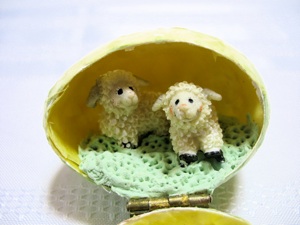 これらの卵はいつも人々を驚かせます。作るためには卵の中にドアや窓をのこぎりで切る道具が必要です。私はミニ電動のこぎりを使います。卵の中身を吹いて出す作業を省略しないで下さい。部屋中に生卵が飛び散ってしまいます(どうして分かったか聞かないでね)ドアを切ったらドアと卵に小さなちょうつがいをのり付けする(ちょうつがいがのり付けされたら、外に飛び出さないようにちょうつがいの角を折り曲げます。)好きなように装飾し中をいっぱいにします。お墓や十字架のある卵は軽い紙粘土のような材料で作り、十字架はつまようじで作りました。羊はオリエンタルトレイディングカンパニーで一セット12匹で購入しました。