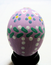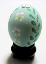 卵のデザインは全部アクリル絵の具に付けた綿棒で描きました。花と点は綿棒の先で書き葉っぱは綿棒の横側で描きました。もし花のスタンプを作りたいなら六本の綿棒をテープでくっ付け花の形を作ります。五本が花びらで六本目が中央で五本の花びらを支えます。だから花にならない側の端は他の綿棒より突き出しています。あるいは消しゴムを削りスタンプを作り卵にスタンプを押すことが出来ます。