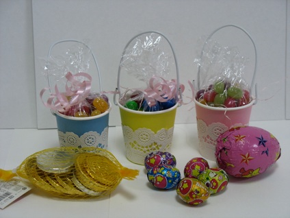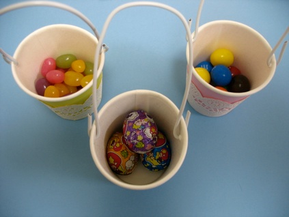 7.子供達が持ち帰れるようにそれぞれのカップに手いっぱいの卵形のキャンディを入れる。(つぶグミ、ジェリービーンズ、ピーナツが入ってるマーブルチョコ、etc.)ラップでキャンディを包んでも良いしリボンで縛ったりチョコレートエッグのように既に包装されているキャンディを買っても良い。