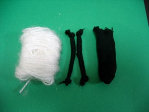 綿(100円ショップのカーアクセサリーの売り場にある)の手袋から一本の指を切り頭にする。2本の袋ひも(100円ショップの手芸売り場にある)を切り四つの端に玉結びを作り足にする。