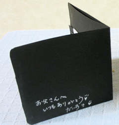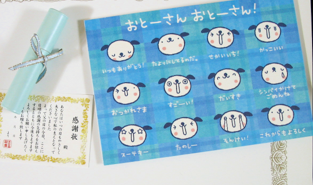 6. 白い紙をいくつかの長方形に切る。アイデイアによって運転免許証やクレジットカードを作り、なにかお父さんについてすてきなことを書かせる.(本を読んでくれてありがとう。)(世界一のお父さんだよ。)(I Love You!)