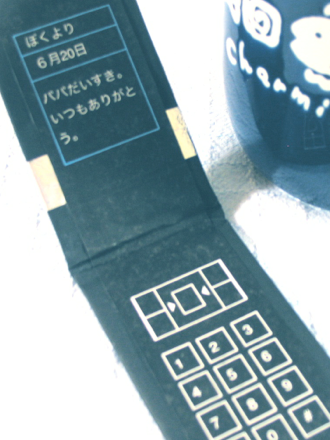 6.外側のカバーを携帯にのりづけする。携帯の角に切り目を入れて丸い角になるようにして折る。閉じた状態でのり付けする。(マグカップの隣の写真のように。)さも無ければ紙がいったん乾いたら長さが十分ではなくなり携帯が閉じなくなる。