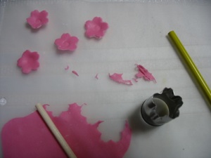 Roll out the fondant very thin, and use a cutter to cut out the flower shapes. Put each flower on your palm, and press the end of the “rolling pin” into the center to give the flower shape. Fill the center of each of the flowers with several sprinkles (included in the Japanese set.)