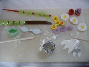 Hint: if fondant gets sticky, rub with cornstarch. When fastening pieces together, touch with a bit of water to make “glue.”