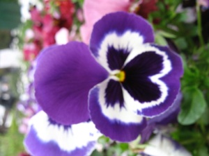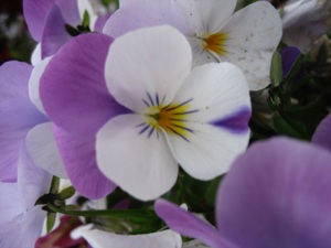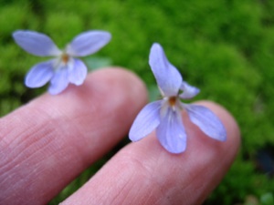 Violets: Mix pink and blue fondant, roll thin, and cut with the cutter with 5 rounded petals. Put each flower in your palm and press the end of the “rolling pin” into the center to give the flower shape. Put blue sprinkles in the middle of the flowers.