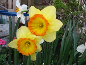 Daffodils: Roll out yellow fondant and cut the base of the flower with the cutter that has 5 pointed petals. Mix pink and yellow fondant to make orange. Roll out thin, cut strips, then form each strip into a tube and fasten to the center of each flower. If you want to ruffle it, roll a toothpick back and forth on the edge before forming it in a tube.