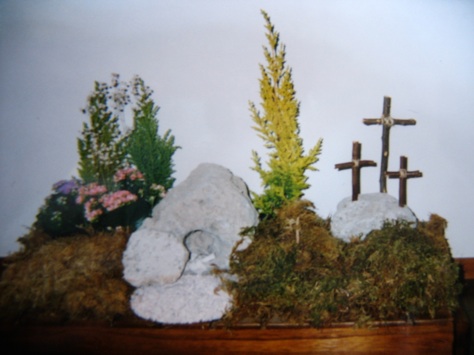 リング型でケーキを焼きます。(このケーキを大小二つに切り分けます。この時中央の穴がきりわける片方のケーキに大きく出るように切ってください。)大きく切り分けた方のケーキを立てます。ホール部分だったところがイエスの墓の入り口となります。切り分けた小さいほうのケーキをこの後方に立て背景の丘となるようにセットします。これにチョコレートやクッキーでできたプレッツエルの十字架を3つ立てます。最後に本物のように細部を飾ってください。