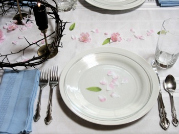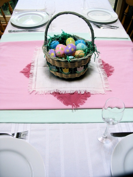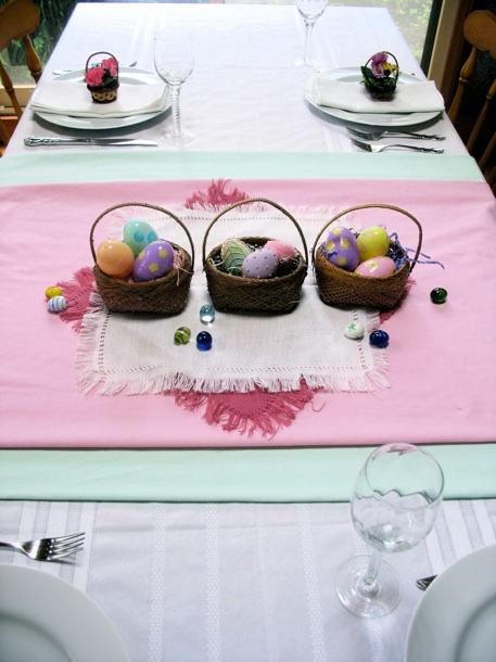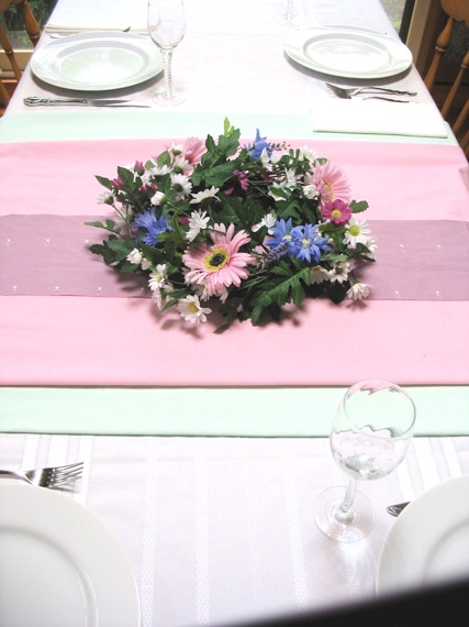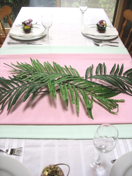 お手軽な方法その1; 100円ショップで購入できるしゅろの葉を、ピンクとグリーンのテーブルランナーの上に重ね置きをします。めいめいのお皿の上には、これも100円ショップからの小さな花かごを置いて飾ります。