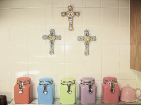 セラミックの十字架は、100円ショップで購入できます。これは、下に並べた缶の色を反映しています。このように壁に三本の十字架を飾った方が、一本よりもより上手に壁のスペースを活用できるでしょう。