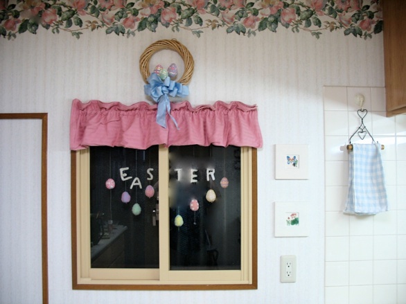 ねんどで作った卵は、リースにつけたり、窓に飾ったり、壁に吊るしたタオル掛けに掛けたりできます。本物の卵をつるすと、ちょっとしたことで落としたりします。すると今までの努力が一瞬で粉々になってしまう危険性があります。私はそれほどそそっかしいほうではありませんが、吊るす作業をする前の段階で、何回か床に落としてしまうこともありましたので、壁に吊るす時は壊れにくいねんどなどでできている卵を使います。 私も娘は小学校の時に、「EASTER](イースター)という文字をねんどで作りました。お子さん達と一緒に作っても楽しいでしょう。