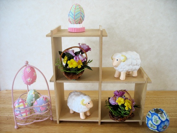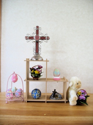 小さな小物置きは、いろいろな小物の置き方が工夫次第でできます。この写真と同じような物が見つからなくても、例えば、十字架、羊、キャンドル、小さな花かごや、ご自分で装飾したイースターの卵など、何でも思いつくままさがしてみてください。生卵の中身を出し、外殻を飾ってもよいですし、ねんどで卵を作ってみてもいいかもしれません。本物を使わない一つの利点は、壊れにくいことです。活発なお子さんがいらして、棚や壁にぶつかることがあっても落ちて壊れる心配はありません。