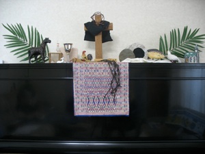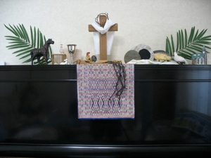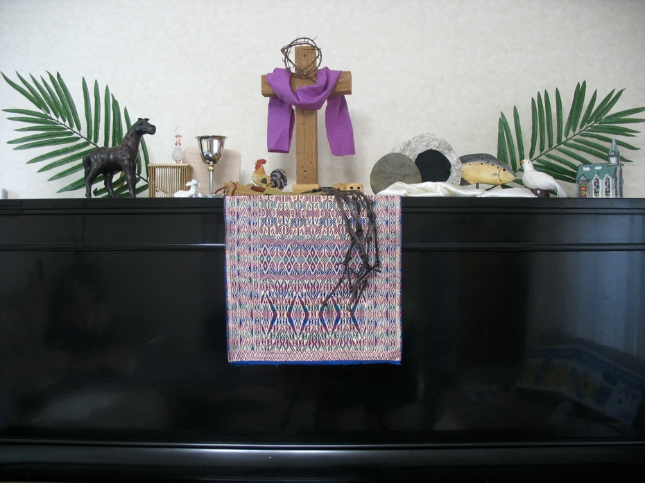 十字架の上の紫の布は、王としてのイエス様をあらわしています。またそれは、イエス様をあざけっていた兵士達が、イエス様の体にかけた衣の意味もあります。この紫の布は、受難日(金曜日)まで十字架の上にかけておき、金曜日の受難日には、イエス様の死を表す黒い布に変えます。そしてイースター(復活の日)の朝には、罪の清めを表す白い布に変えます。この白い布は、死んだイエス様がくるまっていた布の意味でもあります。