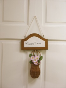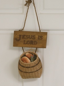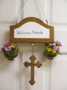 これらの写真は、イースター用のウエルカムサインのサンプルです。ーー左側の写真から、小さな花かごを取り付けたもの、次は最後の晩餐を象徴するぶどうとパンのかご。右から2番目は十字架の上でイエス様が成し遂げてくださった罪の許しを信じたときに受ける、新しいいのちを象徴する十字架とお花の飾り。そして一番右のものは、イースターに限らず何時でも使用できるものです。この飾りは、小さな男の子が持っていた5つのパンと2匹の魚で、イエス様が5000人の人々にたべものを与えてくださったことを覚えるためです。あの当時5000人もの人々に給食を下さいました。現在の私たちにも、イエス様は私たちの必要を満たしてくださるお方です。