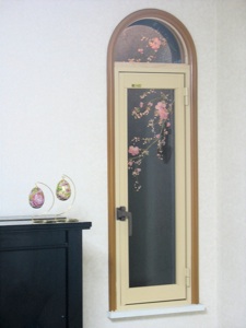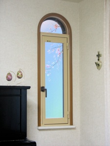 この窓は一日の内、時間帯によって色の変わるすてきな窓です。ビーズの花は100円ショップで買えるものです。陽がさす時間帯はキラキラ輝き、夜は外灯の光を受けて輝きます。この窓ガラスは霜模様なので、外が見えません。このような場所にお花を加えると、楽しさも増すでしょう。イースターエッグやキャンドルなどを飾ることで、さらに華やかさが出てくると思います。