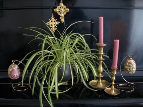 季節感を出す別の簡単な方法は、室内観葉植物にイースター風のデコレーションを合わせてみることです。ご自分の想像力を発揮してください。ここにある写真の2つのアレンジメントは、同じ観葉植物を使っても、違う小物の組み合わせによってまるで違った雰囲気になります。左側の写真は、羊のぬいぐるみと卵のバスケットを置くことによって、少し遊び心のある雰囲気がでているのがおわかりになるでしょう。右側は、真ちゅうのスタンドにキャンドルを置き、金色の十字架と卵をスタンドに吊るしてみました。するとこちらの方が、優雅な雰囲気をかもし出しています。十字架は観葉植物のポットの土の中から出ている留め金にひっかけています。このような小物は自宅にある針金でできている洋服のハンガーを適当な長さに切って、片方の端に輪を作るように折り曲げて作ります。金色の十字架は、安いクリスマスのオーナメントとして売られていますが、クリスマスシーズンだけに限らず使ってみてください。