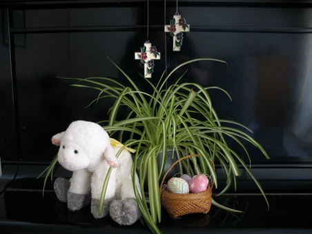 十字架はイースターの季節に最適な飾りです。というのは、十字架の上でのイエス様の救いのわざを明確に表すからです。単に十字架の飾りといっても、驚くほど多種のデザインや、安い値段で比較的簡単に日本国内でも買うことができます。ご自分で作りたければ、簡単に作ることもできます。十字架を飾りたいとき、お花やキャンドルと一緒に、または2、3の十字架を一緒に組み合わせて飾ってみてください。ほかにも多くの違ったデザインの十字架を窓枠に一つおきに掛けてみたり、掛け軸の棒にいくつか掛けてみたり、または単一で電気スイッチの上や、リースの代わりに十字架をドアの上に掛けてみたり、洗面所のタオル掛けの上に飾ってみたり、とちょっと思いがけない場所に飾るのも楽しいと思います。