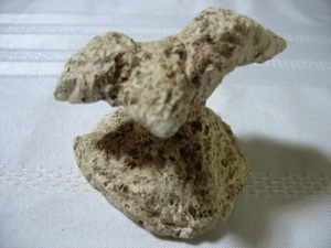 カーヴィングはやり方次第で何才の人でも出来るものです。4~5才の子どもたちでしたら、オアシス(フラワーアレンジメントに使う緑のフォーム)のブロックをスプーンかテーブルナイフで削ることが出来ます。小学生なら石鹸のかたまりか、バーミキュライト(苗床の土に使う光るもの)を混ぜた石膏(これは本物の石のように感じるでしょう。左の写真参照。)で。100円ショップでは乾かした後に削ることの出来る石に似た粘土を売っています。中学生はおそらく木か本物の石を削ることを好むでしょう。100円ショップには、カーヴィングのツールやハンコを作るための柔らかな石も売っています。いらないところを削りとっていくという考えは難しいかもしれません。そこで、どの年代の子どもたちにも、作品作りの第一段階としてオアシスを使うことが助けとなります。