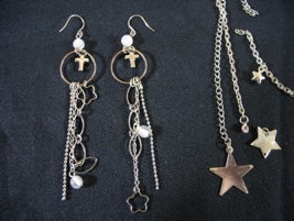 写真左の十字架は4本の釘をラッピング用の金の針金で留めたものです。真ん中のイヤリングは100円ショップで買ったビーズで作りました。右の十字架のイヤリングも100円ショップで見つけたものです。