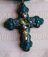 この十字架は金属で作られたものです。でも似たような十字架を、木やダンボールの上に布用絵の具をたらし、それが乾かないうちに“宝石”をはめ込んで作ることが出来ます。土台は、木やEVAフォーム、軽い紙粘土で作ります。もしあなたがトタンばさみを持っていれば、うすい缶を十字架の形に切り出すことも別の方法としてあります。多くのアメリカのクラフトストアには、土台として使えそうな木の十字架を売っています。