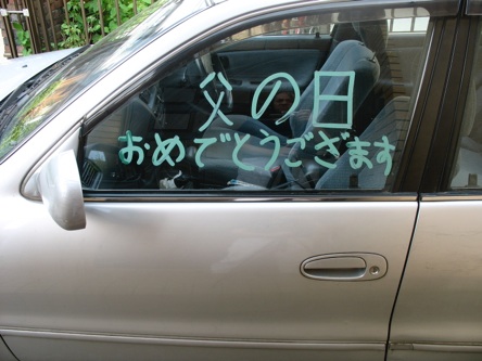 Buy one of those sports booster flags that you roll into the car window (sometimes sold at dollar stores) and change it to a Father’s Day message, and put it on the car window. If you can’t find one of those, write a message onto a plastic triangle, and tie it to the car antenna. It will flap in the wind, and look very presidential.