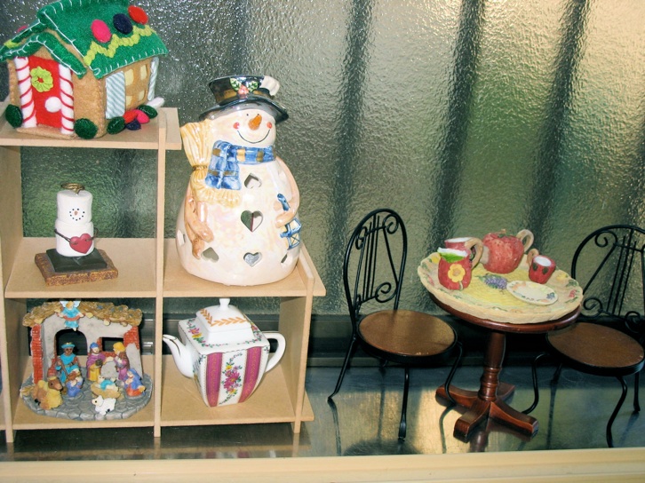 小さい棚にはあまりにも小さすぎてそれだけでは目立たないようなデコレーションを飾ることができます。ジンジャーブレッドの家はフェルトのマーブルチョコなどフェルトで出来ています。正面玄関のリースは屋根のつながった飾りのようにリックラックで出来ています。煙突から出ているのは詰め綿で出来た煙です。シャッターはガムに似ているのはストライプの布でフェルトの長方形を包んでいます。ポーチの柱はフェルトを巻いてチューブを作り回りにリボンを巻きました。ピンクのティーポットとテーブル、椅子は棚とともに百円ショップで買いました。