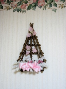 ピンクと白のデコレーションは単にフレームの穴に入れただけです。この木の白い枝やリースは百円ショップの白いクリスマスツリーから切り取りました。ツリーを切るためのワイヤーカッターも百円ショップで買いました。