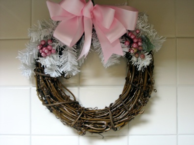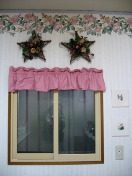 ピンクは普通赤のところを変えましたが、特に家全体が赤であふれていればおもしろい変化です。つたのリースのダークブラウンは白い背景に目立つようになっています。リース、リボンの蝶結び、枝や木の実はみんな百円ショップで買ったもので、右の写真の同じセットのように見える木を作るためにも同様に使いました。