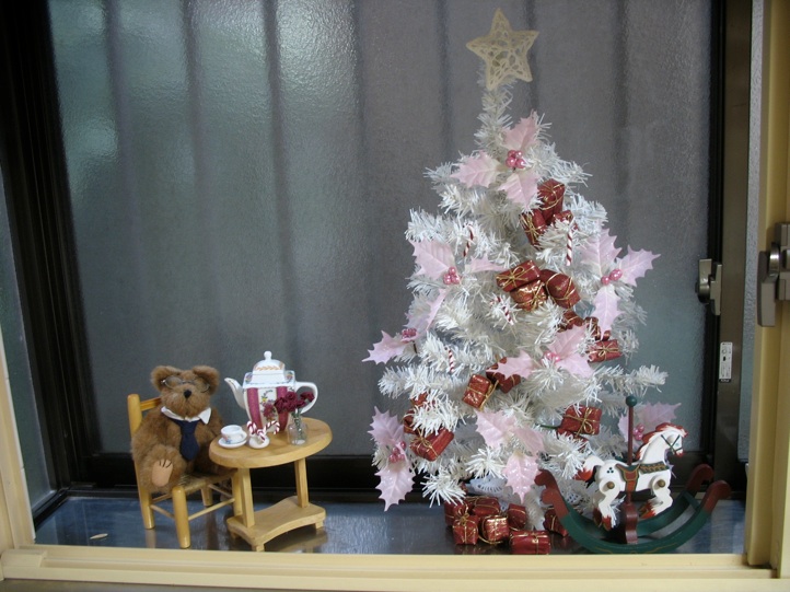 熊さんはホットチョコレートを飲んでいるのでしょうか?それともキャンディケーンといっしょにミントティーを飲んでいるのでしょうか?熊と揺り木馬は百円ショップで買わなかった唯一の品ですが、たまにかわいい熊もそこで買えます。柊の葉と実は百円ショップで見つけたピンクのデコレーションでした。葉はつたの上にあるからこの木を飾るためにむしり取りました。小さいキャンデイーケーンはスカルピーで出来ていました。もし自分で作りたいなら、白のロープと赤のロープを作りそれらを一緒にねじり、杖の形を作りパッケージの説明書に従って焼きます。