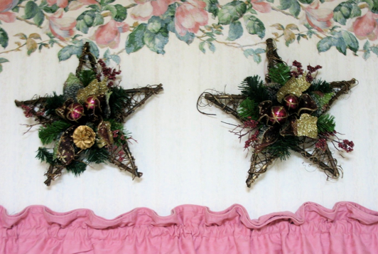 これらの加工していない星は空間にちょっとしたクリスマスの雰囲気を加えてますし、リースとは違う楽しい空間の変化です。栗色の装飾は真っ赤よりももっとうまく調和しています。これらは百円ショップでは買わなかったけれど、ちょっとした緑の木で自分で飾ることが出来るようなこれらの加工していない星は売っています。