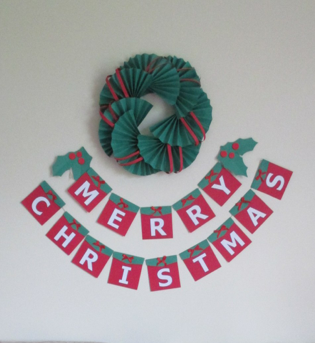 この“Merry Christmas”の飾りは、飾られた所で暖かさを伝えます。これ一つでも、あるいはペーパーリースやペーパークリスマスツリーと一緒でも素敵な飾りになります。これは紙で作りますから、とても安価です。また、特にしまう場所を考えなくても、たたんでファイルホルダーや封筒に入れておくことが出来ます。