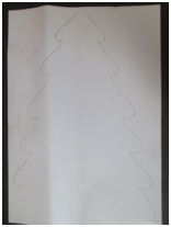 ・このクリスマスツリーの前面と後面をダウンロードしプリントアウトします。薄目の厚紙や大き目のシリアルの箱などに貼り付けます。ゆがまないように、糊が乾くまで、本や何か重いものを上に載せておきます。糊が乾いたら、まず前面をツリーの形に沿って切ります。表と裏のラインが一致しなかった場合にそれが問題にならないように、裏側の緑色の紙はアウトラインより大きく広げておくようにしましょう。 黄色い星を作りツリーのトップに糊付けします。