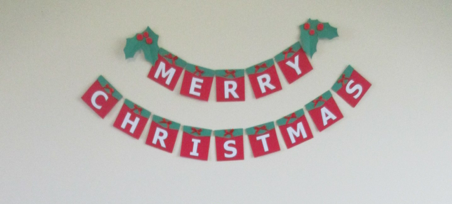 ・貴方のコンピューターから文字をプリントアウトします。色紙(ラッピングペーパーの残りでもいいでしょう)を長方形に切り台紙を作ります。文字をその長方形の台紙に貼ります。それぞれの台紙の上の部分を表側か裏側に折ってひもを通す場所を作ります。上の写真のように、私は緑色の折り返しを作り、赤い台紙の裏側に糊付けて、前側に折り返して貼りました。その緑の折り返し部分に小さな赤いボウを貼り付けています。緑のヒイラギの葉と赤い実を切り出して“MERRY”の台紙をつなげたひもの両端に付けてみました。