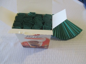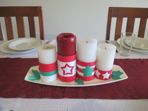 もしろうそくの高さが違うとさらに面白く見えるでしょう。この写真のろうそくは皆同じ高さですので、私は違う高さの缶を探しました。貴方はこのろうそくをアドベントリースとしても使うことが出来ます。(リースなしのアドベントリースです)クリスマス前のアドベントの最初の週に1本のろうそくを灯し、次の週に2本を、三週目に3本を、そしてクリスマスの前の週に4本を灯すのです。もしリースの形にしたければ、長く置く形の代わりに丸いお皿を使ってください。そして沢山の紙の葉を作って缶と共にそのベースをうめます。それぞれの葉を真ん中で折って葉脈をつくると、平らな葉の代わりに3Dの葉になります。