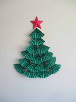 このクリスマスツリーは紙で作っていますのでとても安価で本当にすぐに作ることができます。緑色の紙をアコーディオン状に折ります。そして赤い紙を折ってちょんと切れば始まりです。簡単な折り方で3Dの星になります。そして全てをファンタックで壁にとめます。(壁にとめるものは他にも色々な種類があります。壁にとめる他、厚紙や掲示板に飾る方法もあります。)
