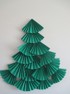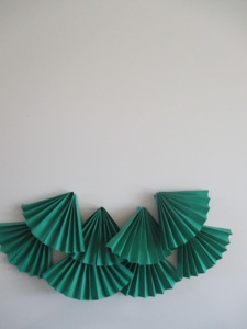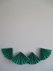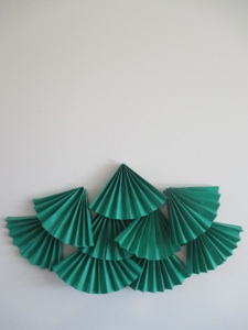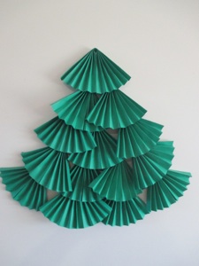 このツリーを作るためにアコーディオン状にした緑色の紙を15用意します。枝を出来るだけ長くするために、色紙の長い方の辺を折ります。折りあがったら真ん中で折って糊付けします。ツリーにするために下の列から上に向かって壁に付けていきます。