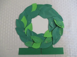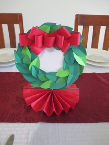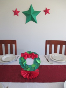 普通リースは壁やドアにかけますが、この時期、リースはテーブルの上のセンターピースにもなるのです。空になったシリアルの箱のようなリサイクルの厚紙を使って作ります。テーブルの上にリースを置くのでドアの方には星を飾ります。これも紙で作ります。貴方は高価な金属の星を買うことも出来ますが、紙で作ることも出来るのです!大きな緑の星は小さな星たちよりそれほど大きくは見えません。それは厚紙で作られています。小さな星は色紙の大きさのコピー用紙で作られています。